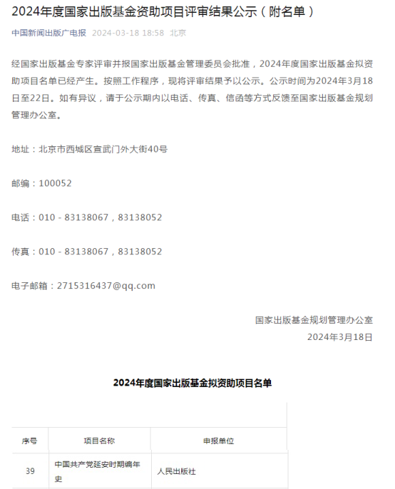 3月18日,国家出版基金规划管理办公室公布了2024年度国家出版基金资助项目评审结果公示名单,我院教授、博士生导师、延安精神与党的建设研究院院长梁星亮总主编的《中国共产党延安时期编年史》获批资助。