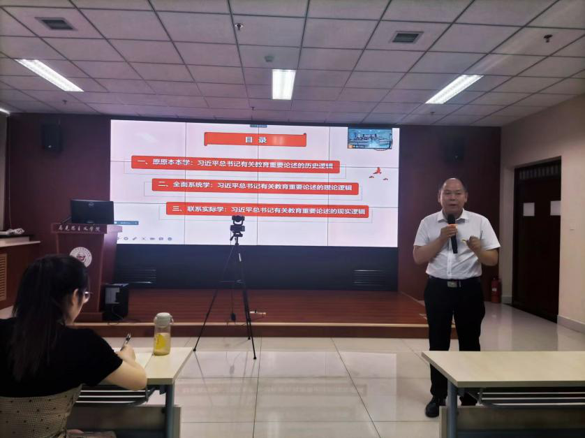 7月8日下午,我院学生第二党支部开展“同心庆七一·喜迎二十大”主题党日活动。此次活动邀请我院常务副院长王强教授为学生党员讲授题为《坚持立德树人根本任务办好中国特色社会主义大学——习近平总书记有关教育重要论述的三重逻辑》的党课,学生第二党支部全体党员参加活动,活动由党支部书记郭媛媛主持。