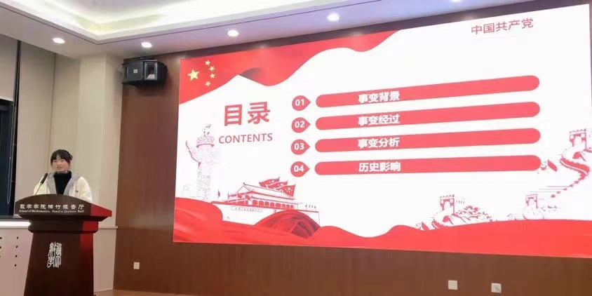 2021年11月8日,马克思主义学院红桅杆宣讲团在数学学院开展了理论宣讲。本场活动的主讲人分别是2020级思想政治教育专业毛苓萱、2020级中国近现代史基本问题研究专业李婕、2021级思想政治教育专业惠靖童、2021级中国近现代史基本问题研究专业黄文馨。