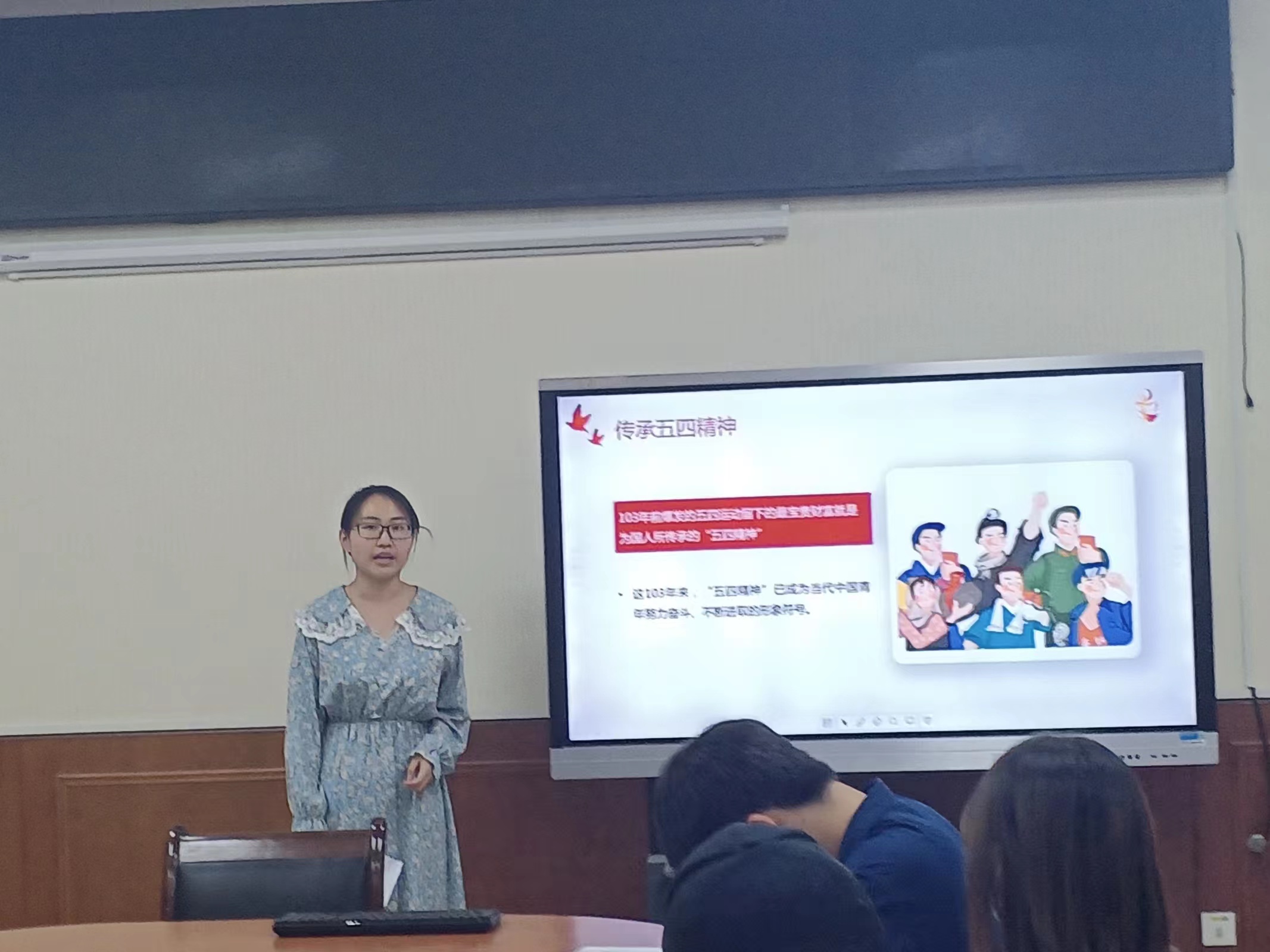 张依芳同学以《热血青春——奋进正当时,青春勇担当》为题,从五四精神的传承、新时代下的青年担当、疫情下的青年担当、青年对未来展望四个方面展开,阐述了五四精神及其对新时代中国青年的现实意义,进而总结出新时代下青年应树立远大理想、掌握专业知识和在实践中磨炼意志品质。最后,她号召同学们要传承五四精神,胸怀忧国忧民之心、爱国爱民之情,勇当青年先锋。