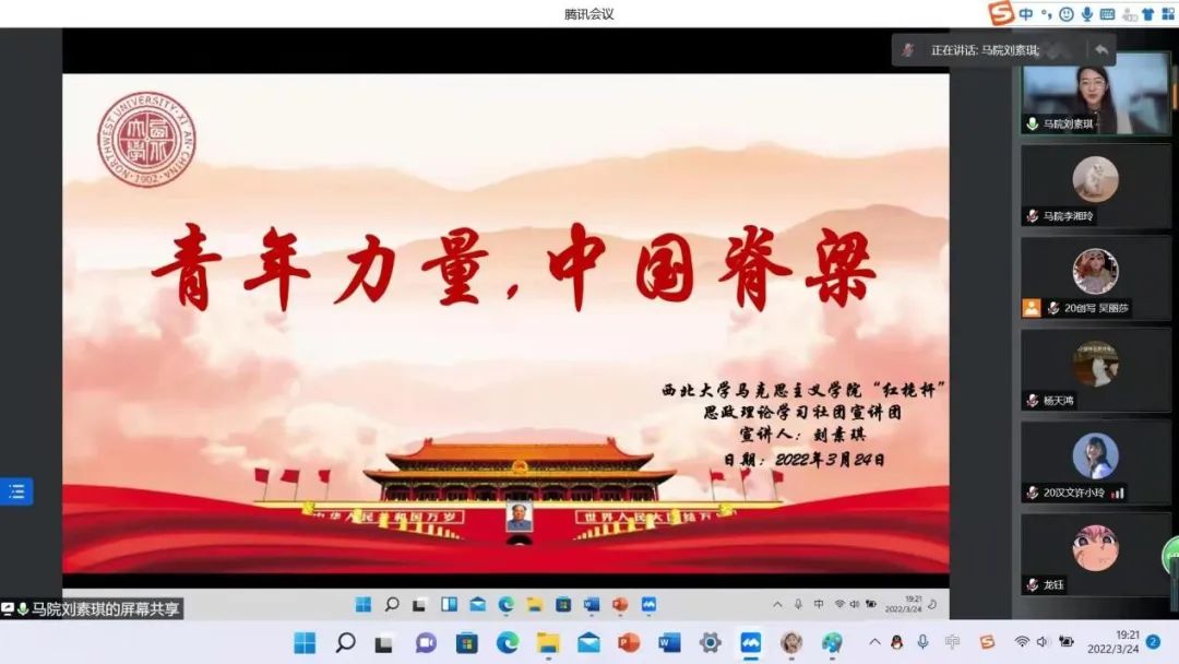 2022年3月24日,马克思主义学院“红桅杆”思政理论学习社团面向西北大学文学院2020级本科生开展了线上理论宣讲活动。本场活动的主讲人分别是2021级思想政治教育专业硕士研究生李晨鹿、2021级马克思主义中国化研究专业硕士研究生高翔和2021级思想政治教育专业硕士研究生刘素琪。