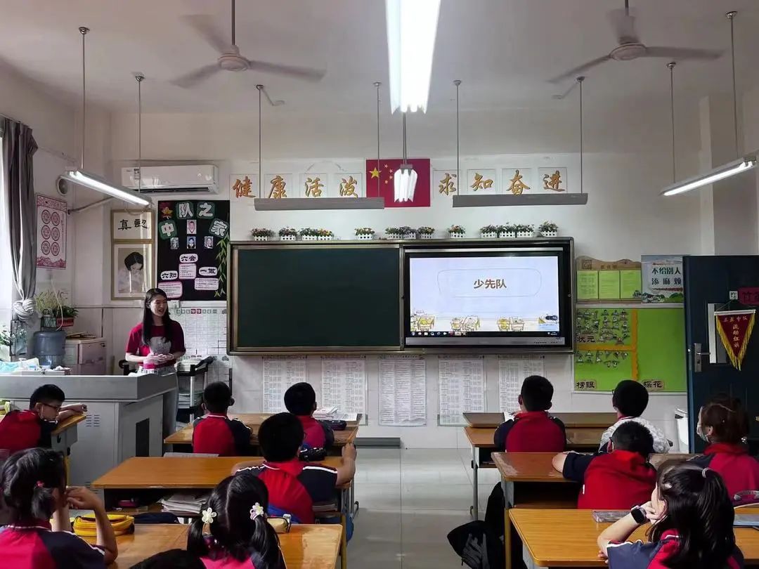 刘素琪通过介绍少先队的性质、为什么要成立少先队以及如何做一名优秀的少先队员,使同学们认识到作为一名少先队员自己身上所担负的责任,伴随着《中国少年先锋队队歌》,她带领同学们再一次重温了入队誓言,让同学们坚定自己要在今后的学习和生活中脚踏实地、诚实勇敢。