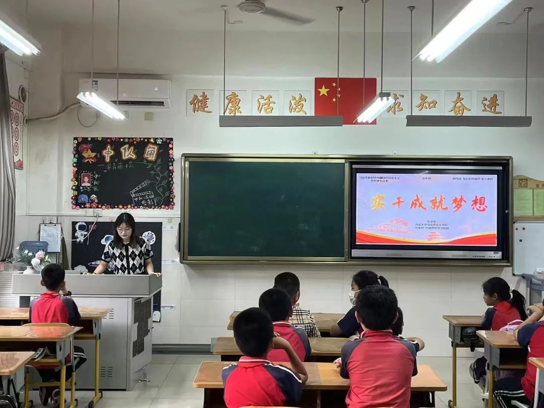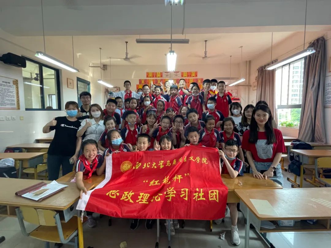 2022年6月10日,马克思主义学院“红桅杆”思想理论学习社团在西北大学附属大学城学校小学部,以《习近平新时代中国特色社会主义思想学生读本》(小学低年级)为主要内容,为四年级的小学生上了一堂韵味无穷的思政课。本次授课的9位主讲人分别是来自马克思主义基本原理、思想政治教育、马克思主义中国化研究与中国近代史基本问题专业的硕士研究生。