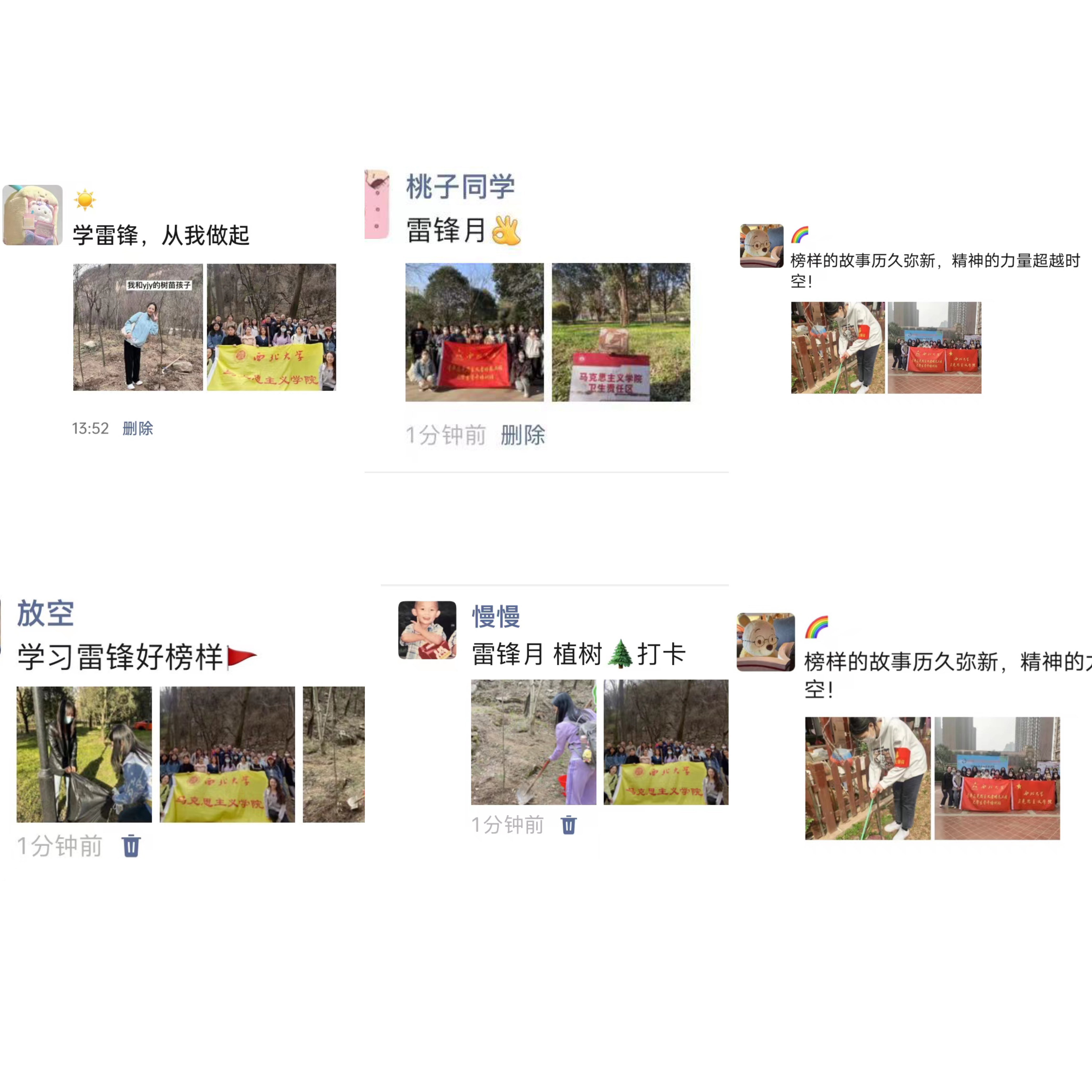 3月24日,我院开展“我的雷锋日记”活动,大家以图片的形式,记录丰富多彩的志愿活动,通过朋友圈的渠道号召广大青年积极参与志愿服务活动。活动一经开展,同学们积极参加,纷纷在朋友圈晒出自己的志愿服务活动,例如:植树、光盘打卡行动、爱国卫生运动、践行垃圾分类等,本活动让学雷锋行为融入日常、化作经常,让雷锋精神在新时代绽放更加璀璨的光芒。