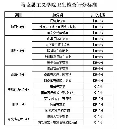 4月26日晚上,我院开展了宿舍卫生安全检查工作,检查标准如下: