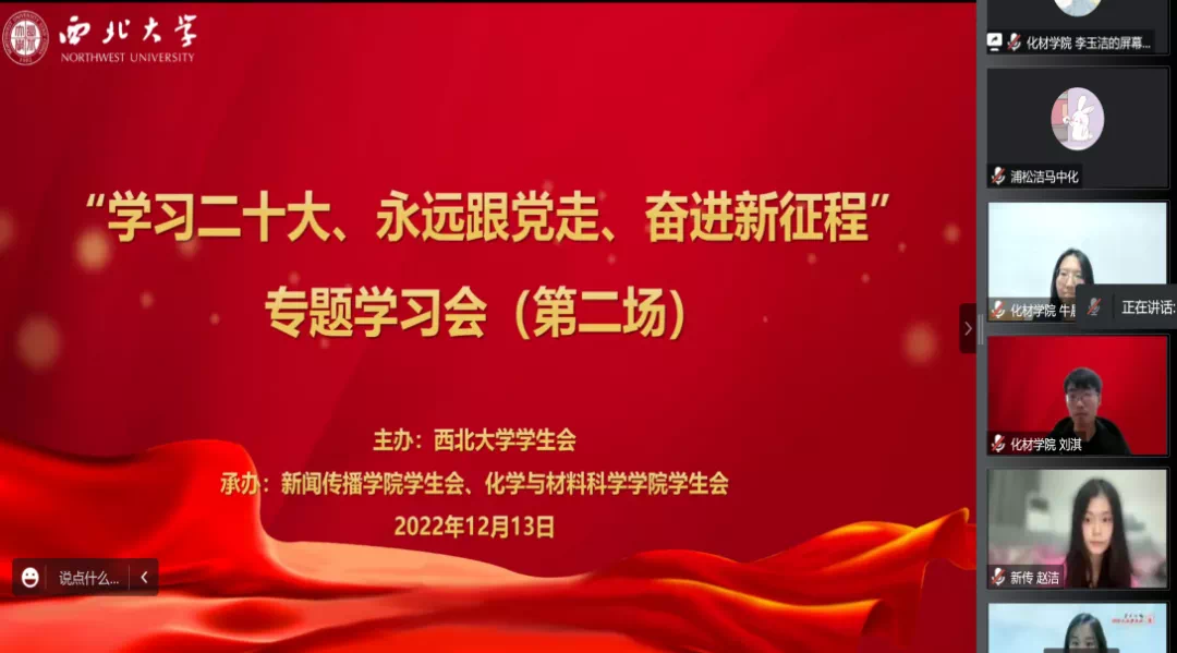 深学细悟笃行,为推动党的二十大精神落地生根,学院推荐5名研究生加入西北大学党的二十大精神宣讲团,推荐4人加入党的二十大学生党员宣讲团,并于11月9日组织参加西北大学党的二十大精神宣讲团成立暨集体备课会。