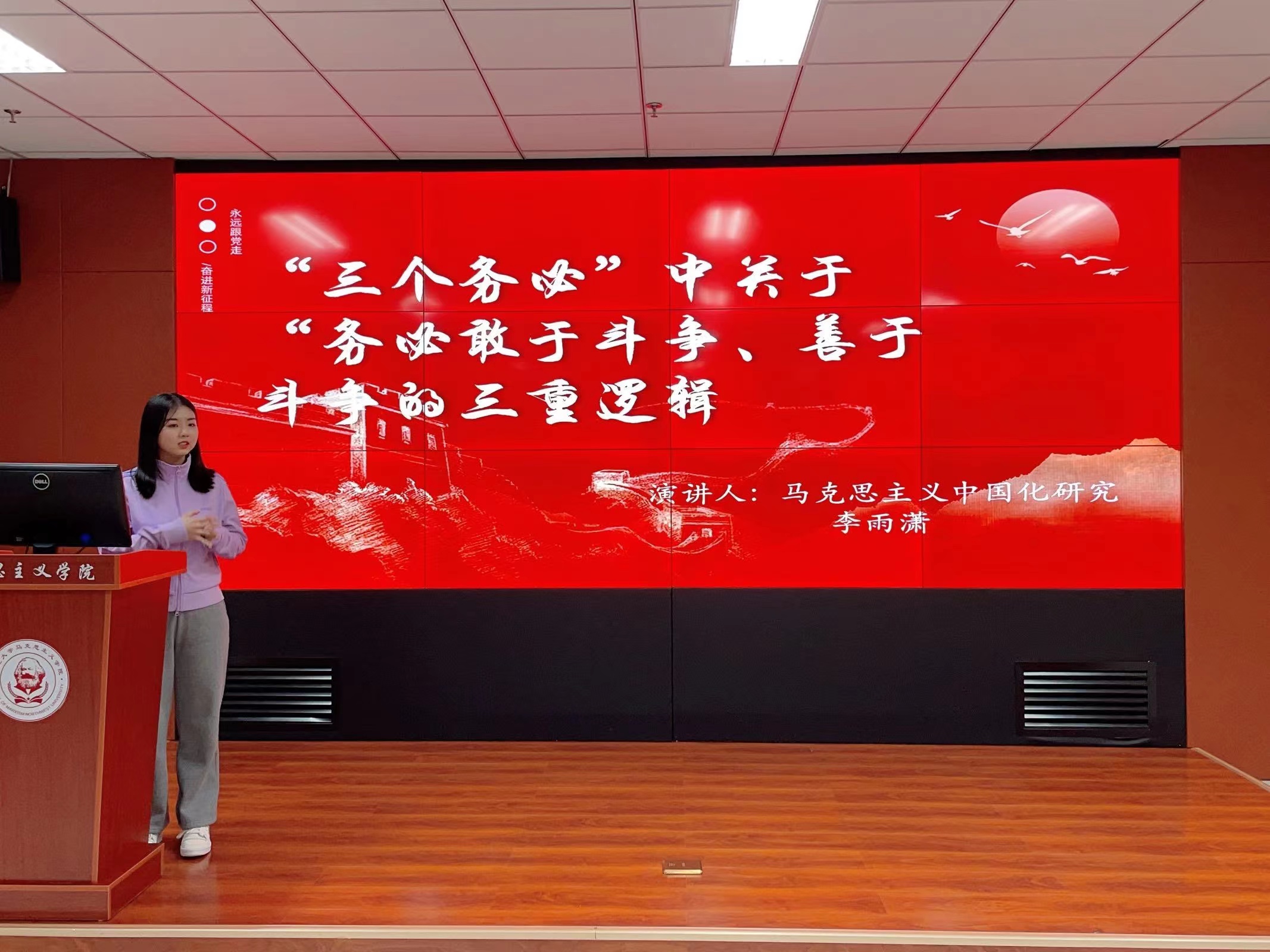 1945年,中共领导人毛泽东在延安窑洞中回答黄炎培的“历史周期率”之问时提出,“我们已经找到新路,我们能跳出这周期率”,“只有让人民来监督政府,政府才不敢松懈”。新时代,党的二十大报告指出,经过不懈努力,党找到了自我革命这一跳出治乱兴衰历史周期率的“第二个答案”。围绕“历史周期率的第二个答案”,马克思主义学院学子围绕这一主题进行了深切讨论,并将其充分应用到理论学习与宣讲中去。