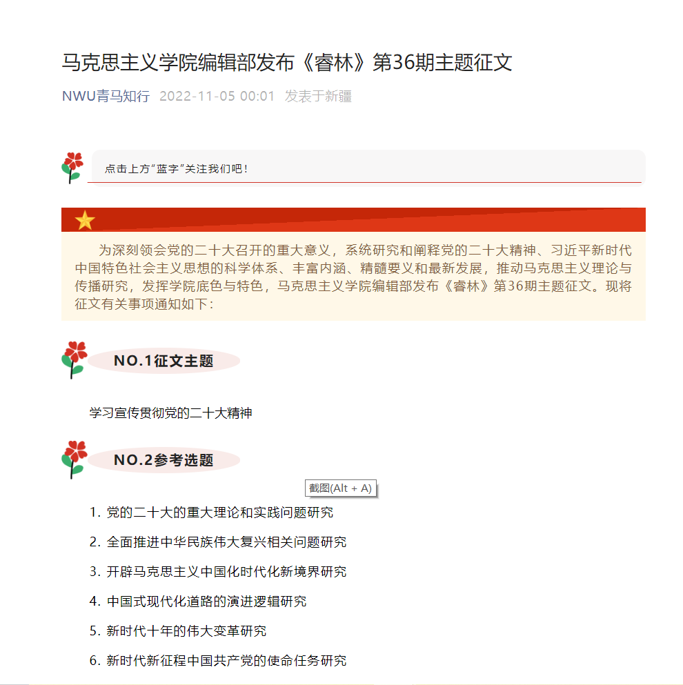 11月-12月,马克思主义学院研究生会发布《睿林》第36期征稿,征稿围绕“学习宣传贯彻党的二十大”相关主题,我院学子积极投稿。稿件充分发挥学院底色与特色,深刻领会党的二十大召开的重大意义,系统研究和阐释党的二十大精神、习近平新时代中国特色社会主义思想的科学体系、丰富内涵、精髓要义和最新发展,努力推动马克思主义理论与传播研究。