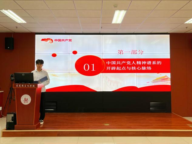 紧接着,西北大学红桅杆思政理论学习社团骨干岳政远和长安大学中国特色社会主义理论学习研究会社团骨干杜长鹏开展理论宣讲。岳政远以《开天辟地大事变—中国共产党成立》为题,以中共一大会址的图片导入,介绍了中共一大召开的波折历程,希望同学们在党的故事、革命的故事、英雄的故事中读懂中国共产党人的初心和使命,让红色基因、革命薪火代代传承。杜长鹏以《伟大建党精神是中国共产党人精神谱系的源头活水》为题,讲述了中国共产党人精神谱系的开辟起点、核心脉络、思想源泉、精神实质、重要支撑与发展动力,鼓励青年大学生从中国共产党人精神谱系中汲取青春奋进力量,做建功新时代的不懈奋斗者。