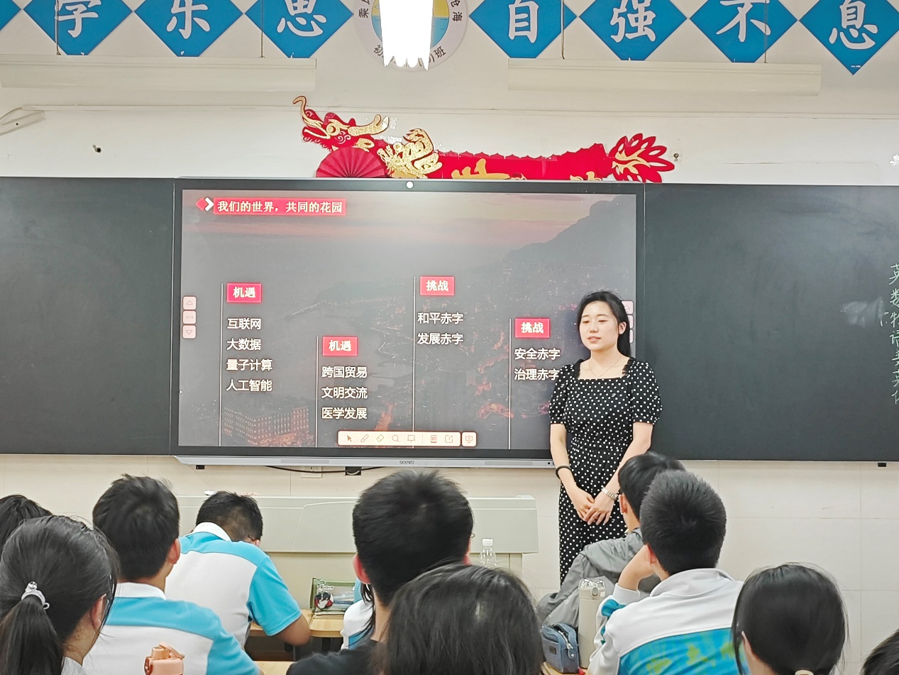 马雪凝以《携手共建人类命运共同体》为题,剖析了全球化带来的双重影响并深入阐述了共建人类命运共同体的倡议,以我们生活中参与的各类活动为例,帮助同学们充分了解中国与世界各国间互利共生、共同发展的美好愿景。