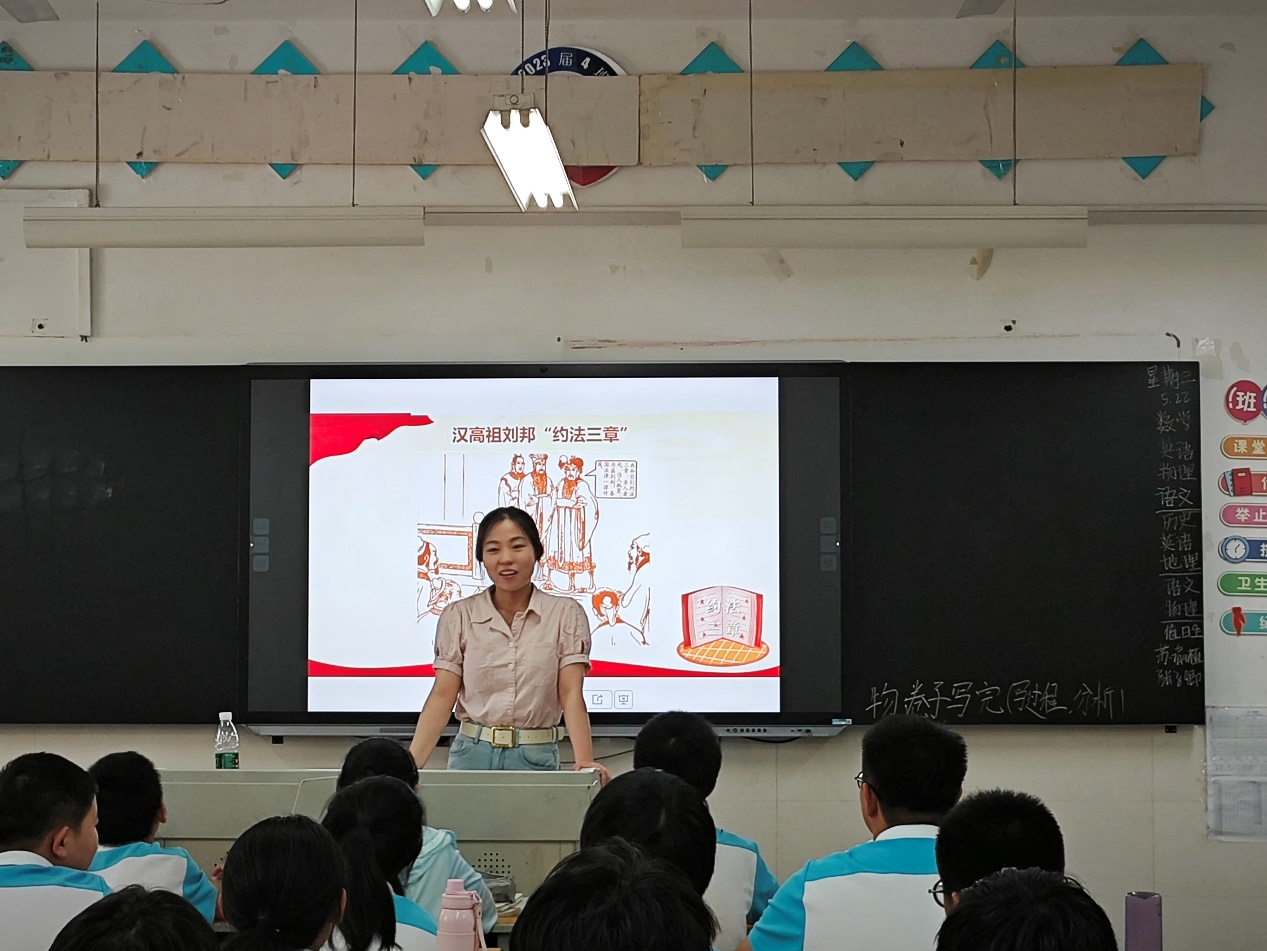 张潇予以《法治兴则国家兴》为题,由“约法三章”的故事导入,讲解中国法律的发展历程,从奉法者强则国强和密织法律之网、强化法治之力两方面内容带领同学们学习了依法治国的具体发展历程和意义,引导同学们要增强法律意识,做遵纪守法的现代公民。