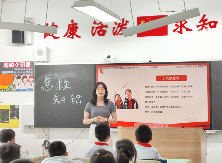 郭颖慧以《光荣的少先队员》为题,通过习近平总书记关爱少先队员的视频为引导,讨论并学习了中国少年先锋队的性质,使同学们对少先队员这一角色有了更加深入的认识。