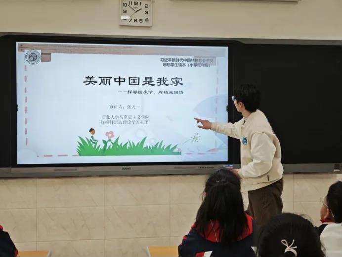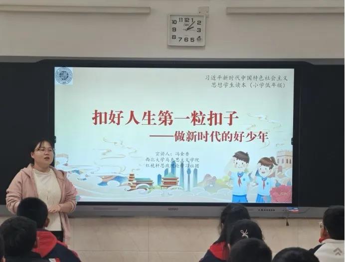 3月28日,我院红桅杆思政理论学习社团在西安航天城第四小学,以《习近平新时代中国特色社会主义思想学生读本》(小学低年级)为主要内容,为三年级的小学生讲授思政课。主讲人是来自2023级和2024级思想政治教育、马克思主义中国化研究、中国近现代史基本问题研究专业的8名硕士研究生。