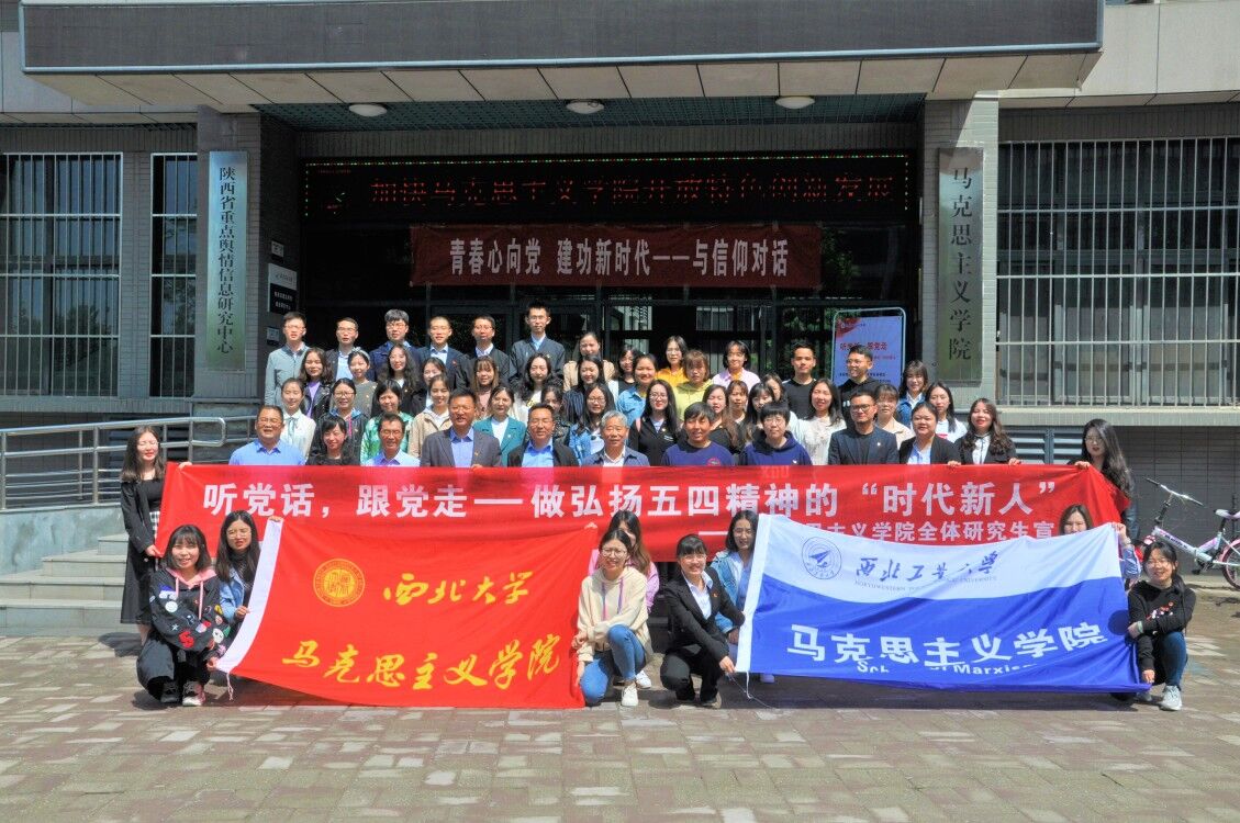 为纪念五四运动100周年,我院党委与西北工业大学马克思主义学院党委依托“边家村高校联盟”平台,共同发起“青春心向党 建功新时代——‘与信仰对话’”主题活动。西北大学、西北工业大学、西安电子科技大学团委负责人,三校马克思主义学院党委负责人、团学干部和青年代表参加活动。