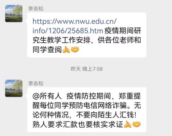 二是抓好导师队伍,导师全面参与学生疫情防控管理。院党委要求全体博、硕导切实负起责任,全面参与、积极配合学院做到学生管理“不漏一人”。学院将全体学生分为6组,由6名院领导带队和导师各负责一组,每个组的工作任务为:一是及时传达各级疫情防控工作要求;二是做好学生思想教育工作,引导学生以积极心态应对疫情,合理安排学习生活;三是结合教学科研要求,每周至少开展一次形式灵活的线上活动;四是了解学生实际困难和需求,及时协调、解决。做到及时关心慰问学生,及时掌握学生思想状况,让学生真切感受到来自学院和导师的关爱和温暖。